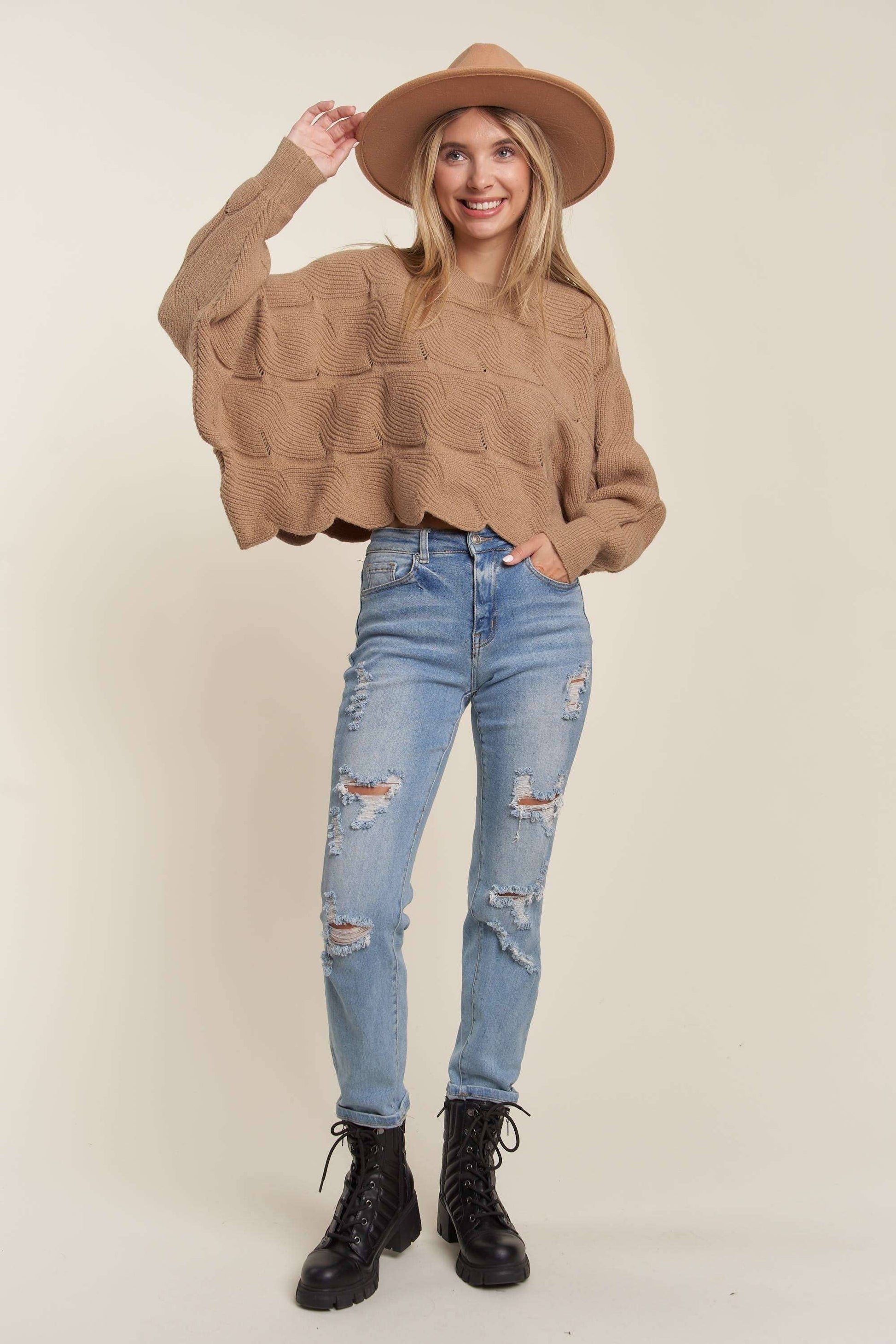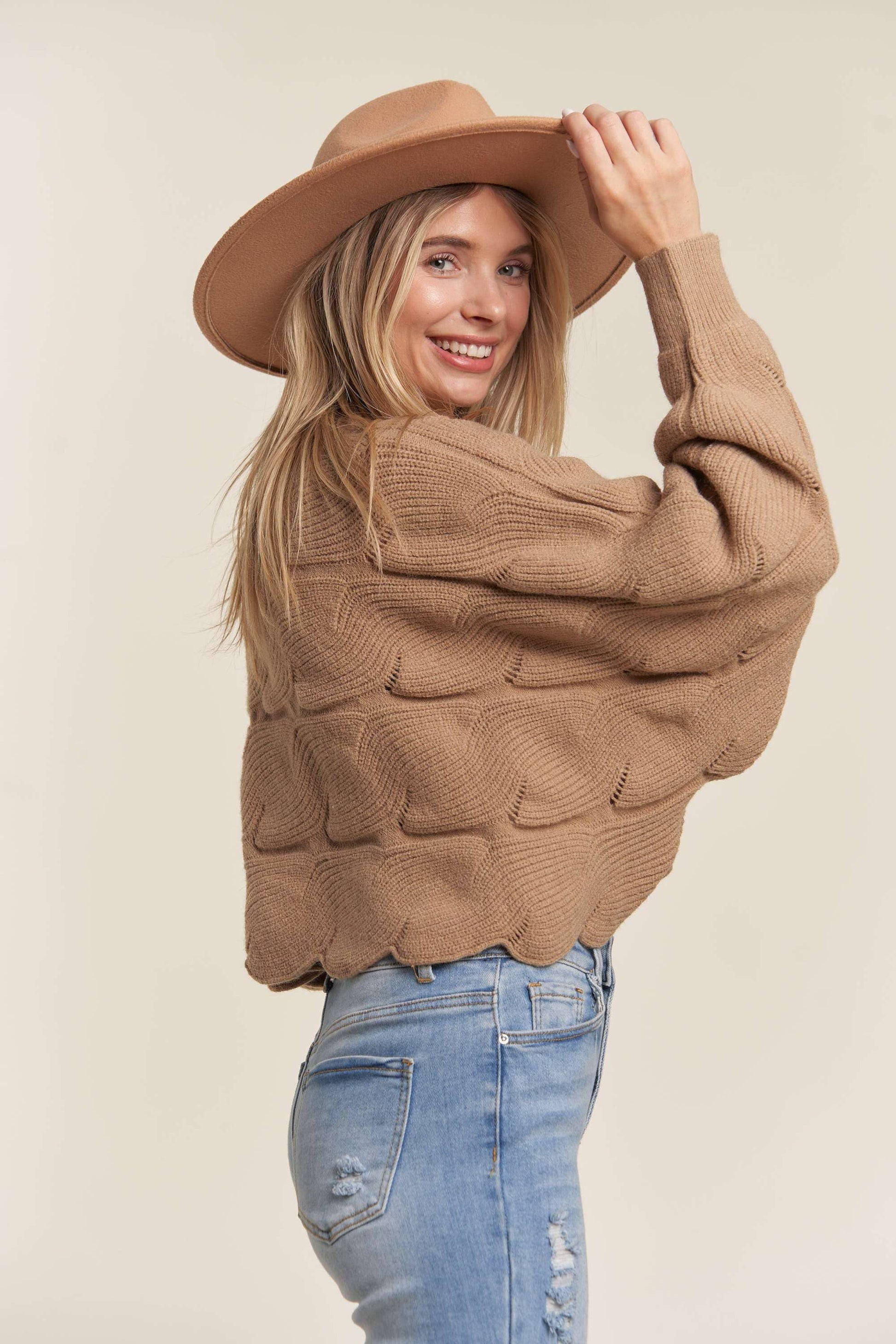 LOOSE FIT SWEATER TOP WITH SCALLOP HEM 43% ACRYLIC 29% NYLON 28% POLYESTER