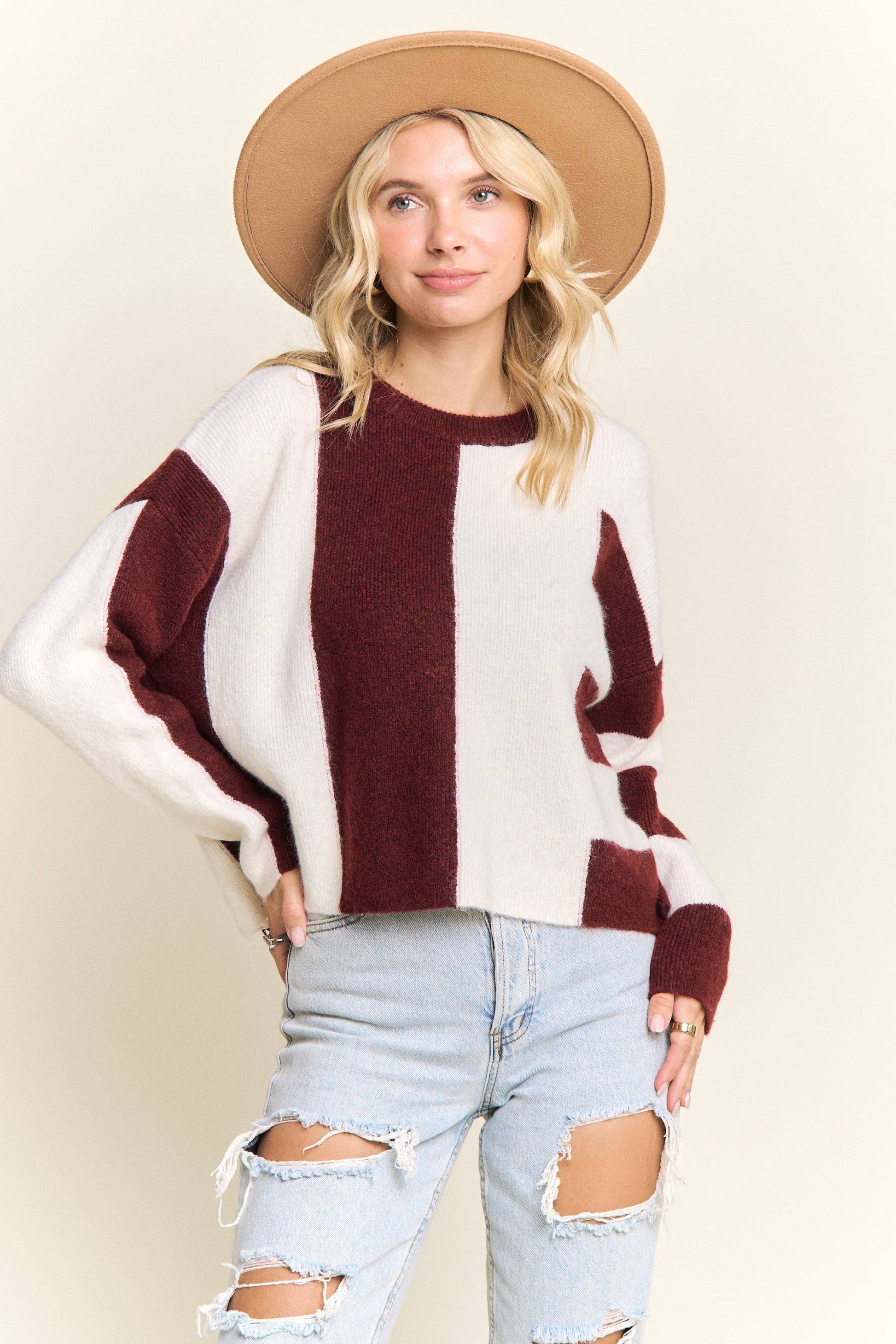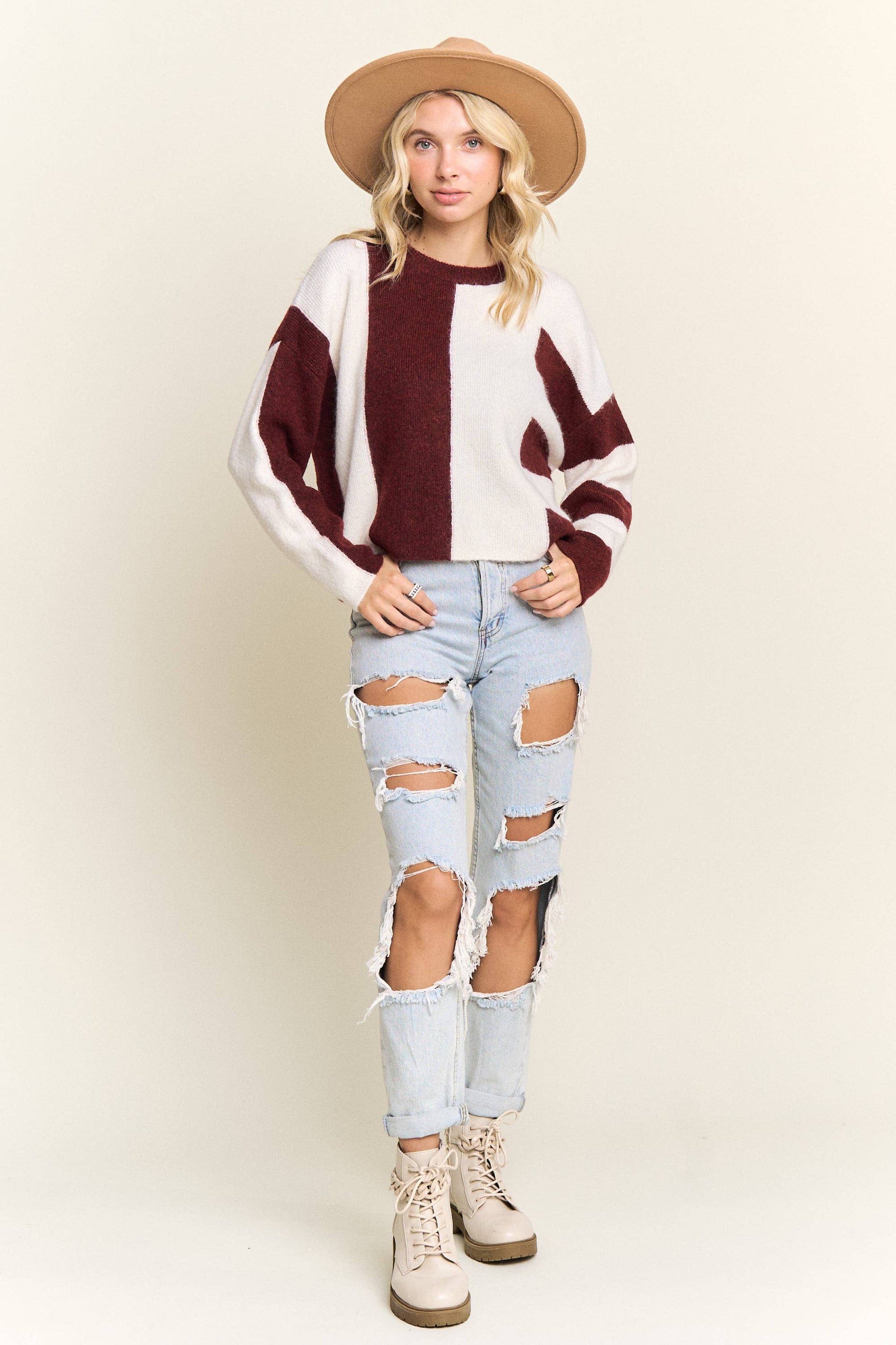Elowen Color Block Knit Sweater | Burgundy/Ivory