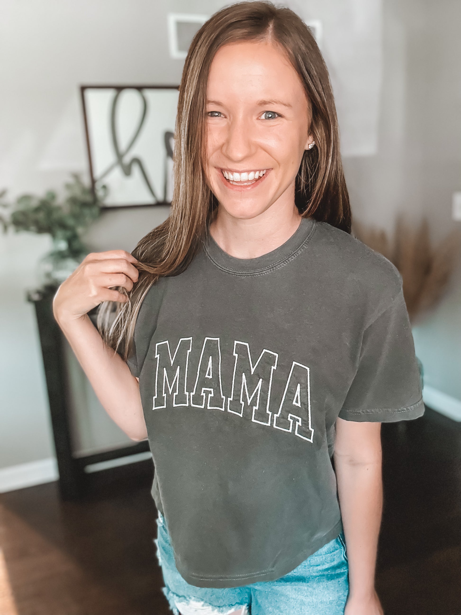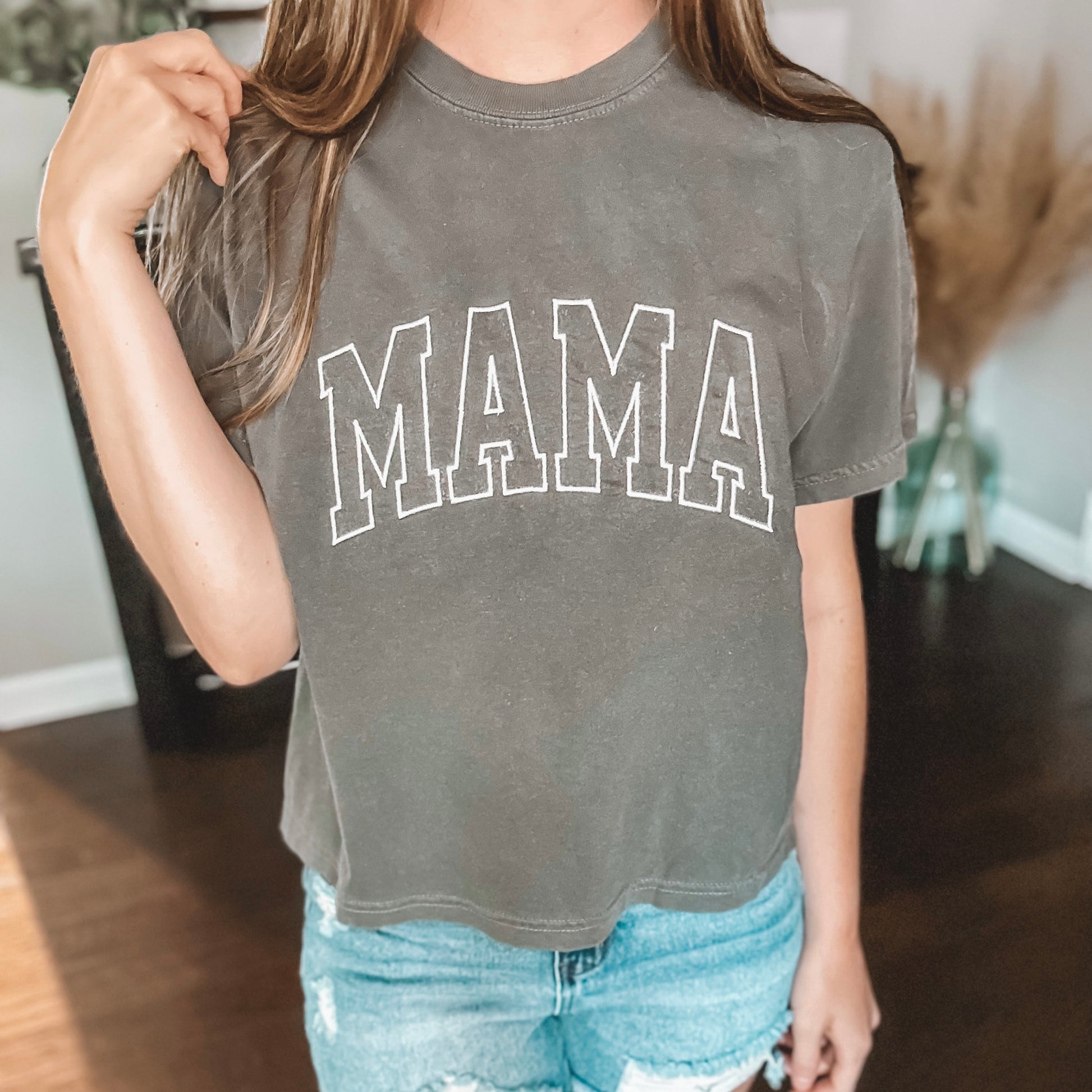 Comfort colors brand boxy CROP tee. White embroidered MAMA.